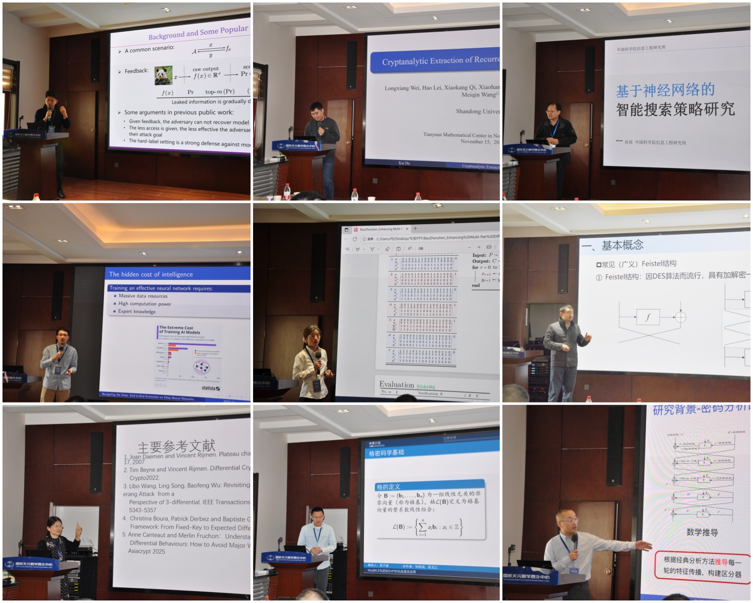在专家报告环节,华东师范大学王高丽教授分享了AES等算法的自动化密钥碰撞攻击研究;中国科学院大学孙思维教授介绍了基于SAT的空间划分技术及其在Ascon-Hash256分析中的应用;国防科技大学孙兵教授深入剖析了Feistel结构的设计与分析;山东师范大学张文英教授探讨了分组密码差分路径对密钥的依赖性;国防科技大学周子健副教授则围绕格密码,展示了近似SVP约化的改进及对Dilithium算法的安全分析。此外,中国科学院信工所孙瑶研究员、清华大学包珍珍副教授、山东大学胡凯研究员等专家也介绍了最新研究进展。会议还设置了专题讨论环节,与会学者围绕对称密码的经典与智能分析、神经网络参数提取等议题展开了深入交流。